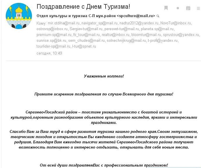 Персональный гид Сергиева Посада Наталия Петровна Алексеева - Поздравление с Днём Туризма