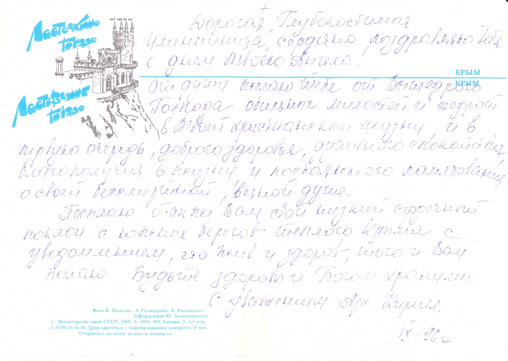 Баюшка был всегда очень внимателен, чрезвычайно добр, очень щедрым предупредительным и бескорыстным. Утешение от него приходило даже при молчаливой встрече - ни слова не скажет, выслушает то, с чем пришла, а уходишь с таким миром в душе, что от всего сердца готов обнять и расцеловать вась мир, дела же как-то сами по себе управляются во благое... Имя Кирилл означает "солнце". Вот он и был солнышком, излучающим тепло и любовь дивно многогранно. Чрезвычайно дороги его поздравительные письма мне на День Ангела, Рождество Христово и Пасху Христову. От о.Кирилла они приходили к нам домой в конверте по почте или курьером. Батюшка всегда отдыхал у своих духовных чад в Крыму исключительно в сентябре. Поэтому с Днём моего Ангела 8 сентября он и поздравлял меня из Крыма. Последнее поздравление было с Пасхой. Батюшка прислал его в 2003г. Письма он писал сначала просто ручкой, потом на пишущей машинке, а в последнее время, похоже, на компьютере. Вот некоторые поздравительные письма из моего архива:
