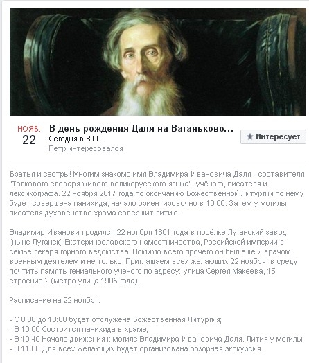 Также 22 ноября чтим ещё и память Владимира Ивановича Даля, составителя великорусского словаря - это очень важное собитие для активации патриотического сознания наших соотечаственников. Сейчас в Отечестве сложный период, в такие времена всегда обостряют умышленно национальный местный фактор, в том числе и языка/диалекта/наречия, что может служить как инструментом для выживания из трагедии в позитив, так и инструментом на раскол/отчуждение/уничтожение народа/народности. Например, вспомним историю мира, в частности, шумеро-аккадскую культуру... Чем дело закончилось? Объединённая культура разных государств в одно государство при установлении одного государственного языка для новой объединённой страны стёрла грани различия между племенем шумера и племенем аккад, и различныых 2 наречия слились в одно. Вот что такое язык, очень сильный разделитель или интеграл в зависимости от поставленной цели правящей структурой!!!
