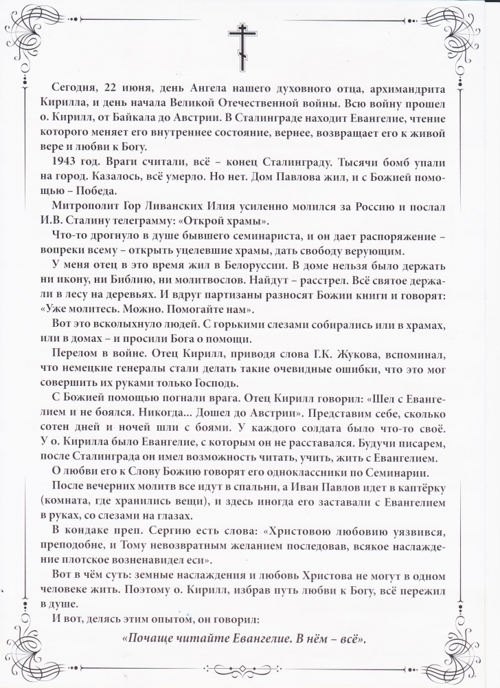В этом году в день представления святого Сергия почиталось ещё одно примечательное событие - исполнилось 100 лет со дня рождения окормителя ПЭБ "Сергиев-тур" старца священно-архимандрита Кирилла (Ивана Дмитриевича Павлова). Не правда ли, это невероятное совпадение... Два года батюшка не дожил до этой своей дивной юбилейной даты. В память о нём в лавре были мероприятия как в монастыре - состоялась премьера документального сериала «Сталинградское Евангелие Ивана Павлова», - так и в Московской Духовной Семинарии и Академии - слушались чтения о жизни и духовном наследии батюшки.