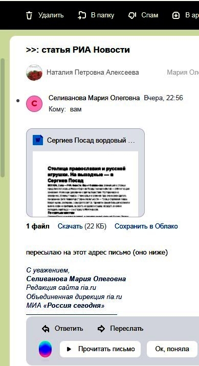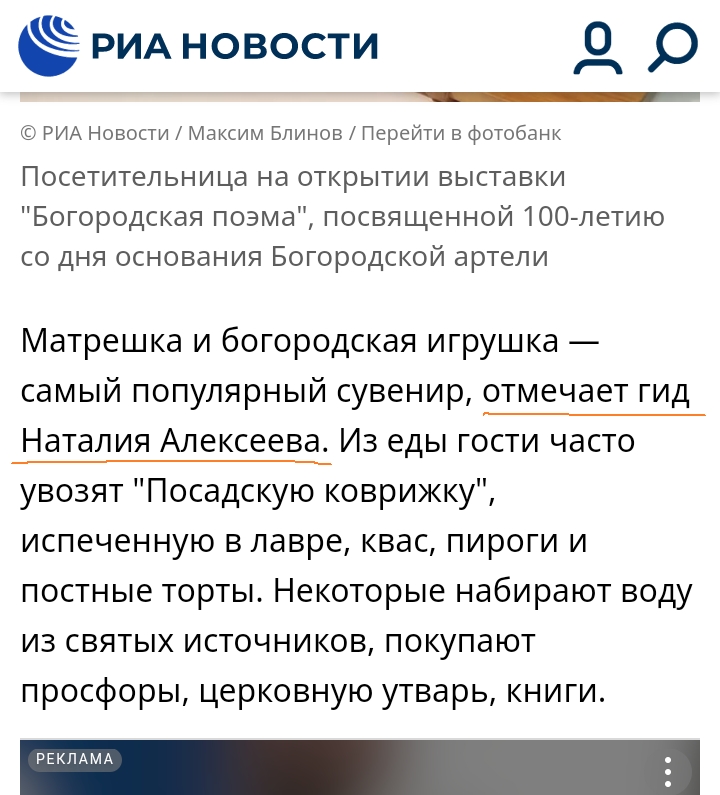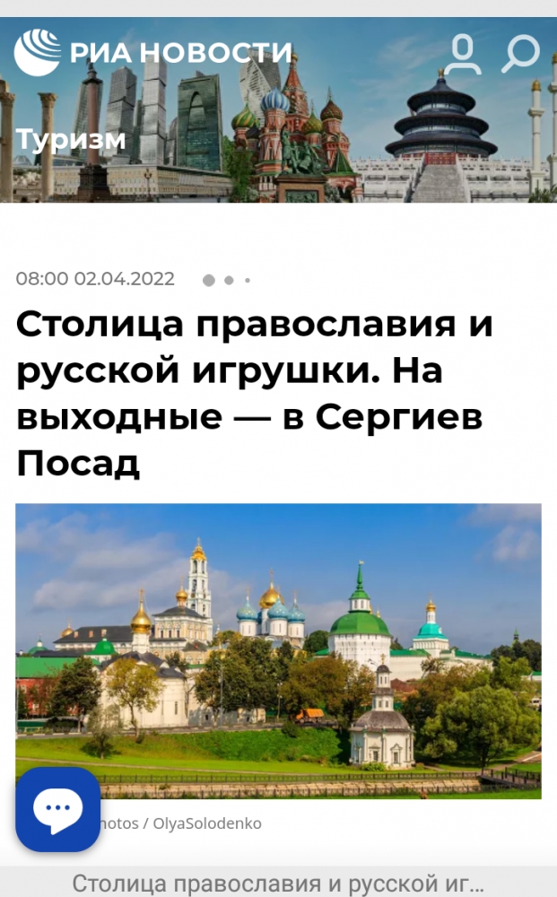 На прошлой неделе, 28.03.22 г., ко мне обратилась корреспондент Селиванова Мария Олеговна из редакции сайта ria.ru Объединенной дирекция ria.ru МИА «Россия сегодня» .Вот скрин из вацапа нашей переписки. Нашла она меня в одной из рекламных ссылок туристического сайта https://needguide.ru/view_guide.php?user_id=3552 и обратилась с просьбой о помощи в подготовке материала для статьи о Сергиевом Посаде. С моим участием получилась вот такая статья: Публикация была позавчера. Приятно участвовать в жизни своего города!