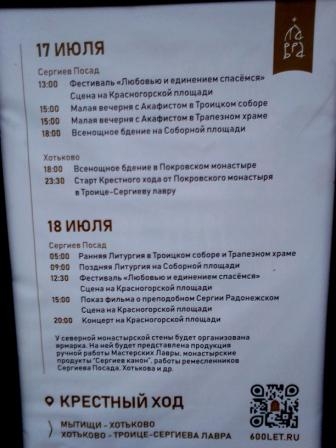 В течение 2-х дней 17 и 18 июля Сергиев Посад, духовный центр православия России, празднует юбилей - 600-летие обретения мощей Преподобного и Богоносного отца нашего Сергия, великого печальника России! 17.07.22 г. - город готовится с утра к празднику, а с 13-00 час начинается праздничная программа. Все дороги перекрыты с этой целью, центр город стал пешеходным на всё время праздника. Все подробности о мероприятиях, посвящённых празднику смотрите на сайте ЛАВРЫ.