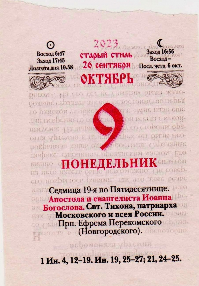 09.10.2023 г. Праздник великих учителей Апостола Евангелиста Иоанна Богослова и Святейшего Патриарха Тихона Московского и всея Руси
