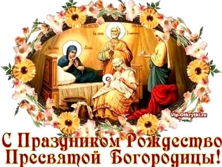 Перевод: Пресвятая Богородица! Ты родилась, и все люди обрадовались, потому что от Тебя родился Христос, наш Бог, наш свет. Он снял с людей проклятье и дал благословение; Он уничтожил смертное мучение в аду и дал нам вечную жизнь на небесах.