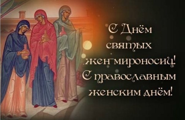 День Жён-мироносиц, празднуемый в третье воскресенье (пятнадцатый день) после Пасхи, является традиционным православным общим женским праздником, имеющим давнюю историю. Святые мироносицы — мужественные женщины, следовавшие за Иисусом на Голгофу — были верными ученицами Христа, помощницами в проповедях и свидетельницами Его крестных страданий. Они не оставили Его даже после распятия. Их вера была вознаграждена. Именно мироносицы первыми узнали весть о воскрешении Иисуса, когда пришли утром к гробнице, чтобы смазать его тело маслом миро.