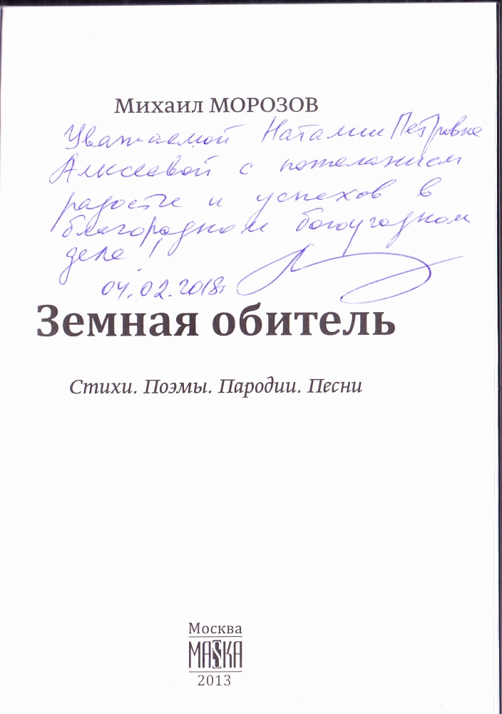 04.02.2018 г. Сувениры от Михаила Сергеевича Морозова, в прошлом моего туриста, нынче творческого гостя в Сергиевом Посаде моим приглашением, и поэтэссы Елены Царёвой-Блохиной, участницы этого вечера, прибывшей с семьёй Михаила Сергеевича (супругой, сыном, дочерью - в качестве техподдержки проведения мероприятия) и двумя коллегами по самобытному творчеству ( в т.ч. с удивительным поющим пожарником по профессии). Встреча прошла очень душевно, почти при полном аншлаге и памятные подарки с автографами унесли с собой домой не только я, но и присутствующие в зале зрители. Мои сердечные пожелания Михаилу Сергеевичу творческих успехов и покрова Божия на творческие круизы!!!