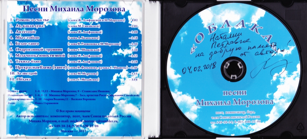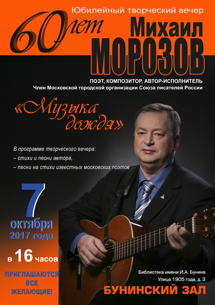 20.09.2017 г. Необычный подарок от супруга москвички Ольги Владимировны Морозовой Михаила, которая приехала на отдых с семьёй и своими гостями из Урала в Сергиев Посад в канун Рождества Приснодевы Марии. Отдых был экскурсионно-паломническим. Собственно подарок - это его песня, в его же исполнении и приглашение на свой творческий вечер. Приходите и все вы, дорогие посетители этой странички, на творческую встречу Михаила Морозова 7 октября!!! Дата, место и время начала встречи указаны на афише - смотрите внимательнно, открыв афишу в новом окне. Вход бесплатный. Жмите на афишу и слушайте песню Михаила Морозова вместе со мной. Приятного прослушивания всем.